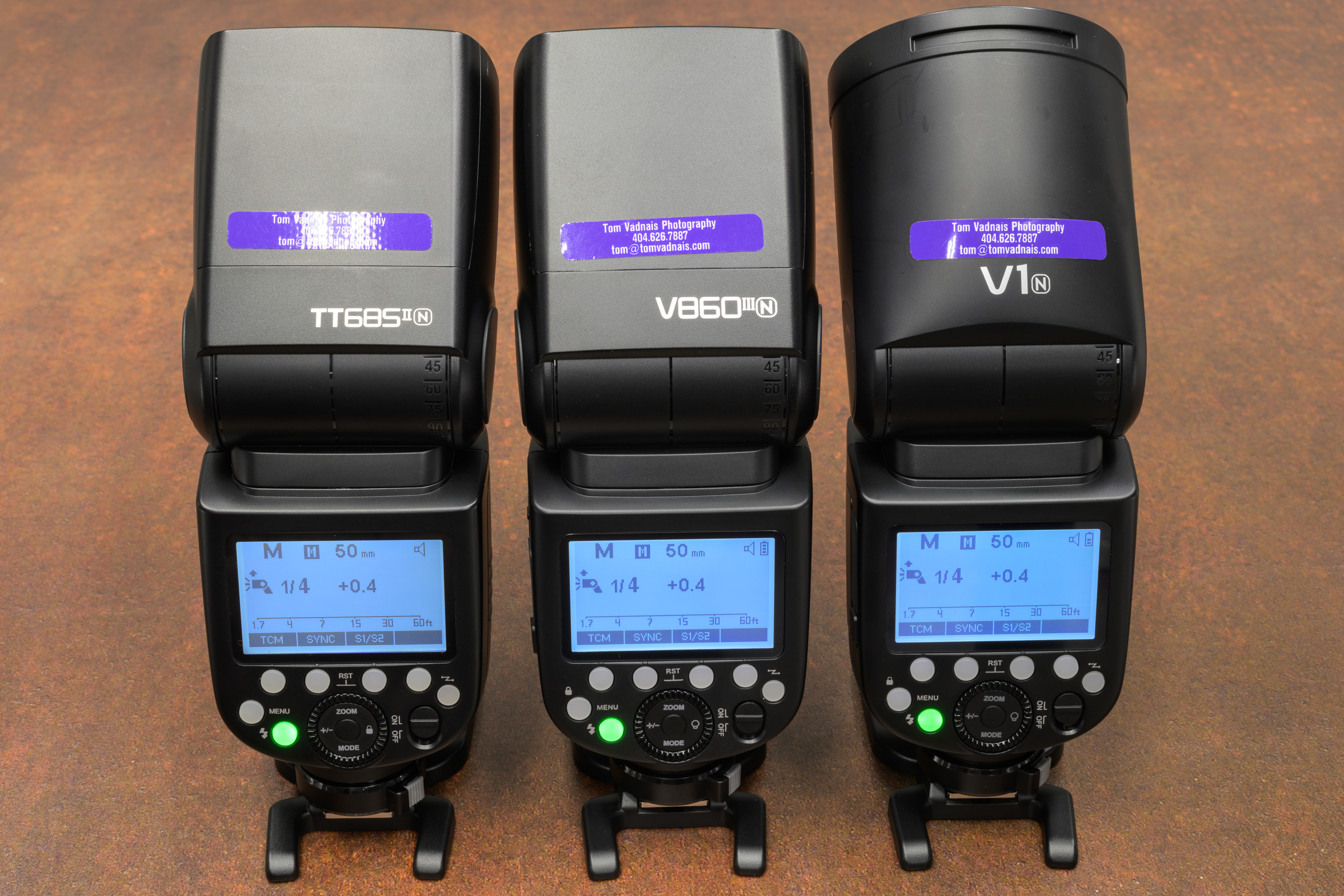 -2- Godox makes versions of each model for Nikon (N), Canon (C), Sony (S), FUJIFILM (F), and Olympus/Panasonic (O). (The M flash at the left below is the TT600 pure manual flash.) These camera-specific versions allow the same full TTL compatibility as do the camera manufacturer’s flashes. They are denoted by the first letter of the camera brand as a suffix. In other words, for a Nikon camera, you would order a TT685iiN or V860iiiN or V1N. [Click on image to enlarge, then click on left arrow to return to post.]